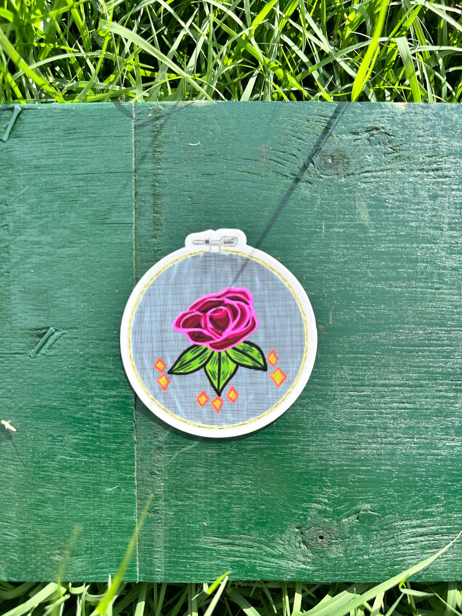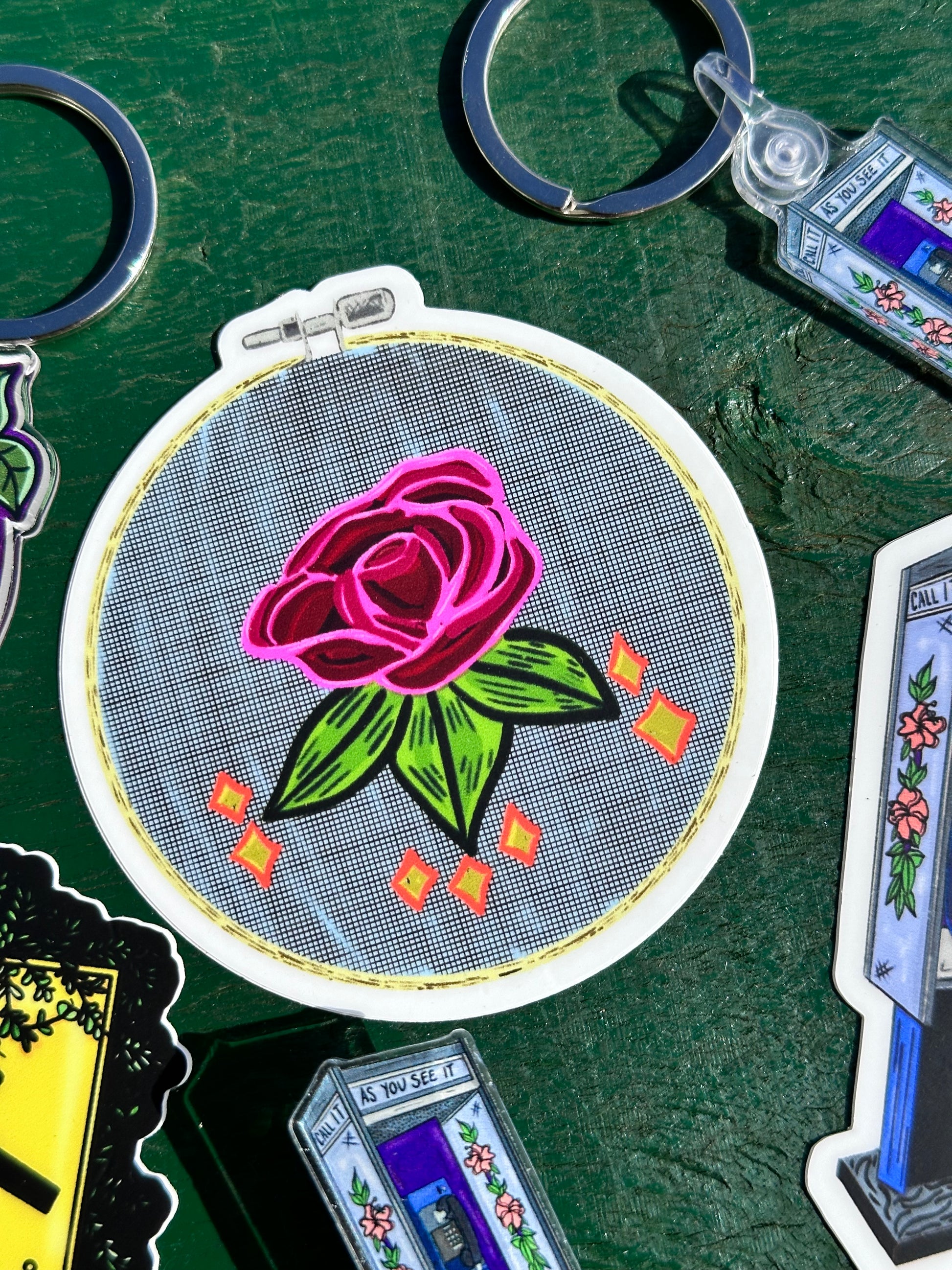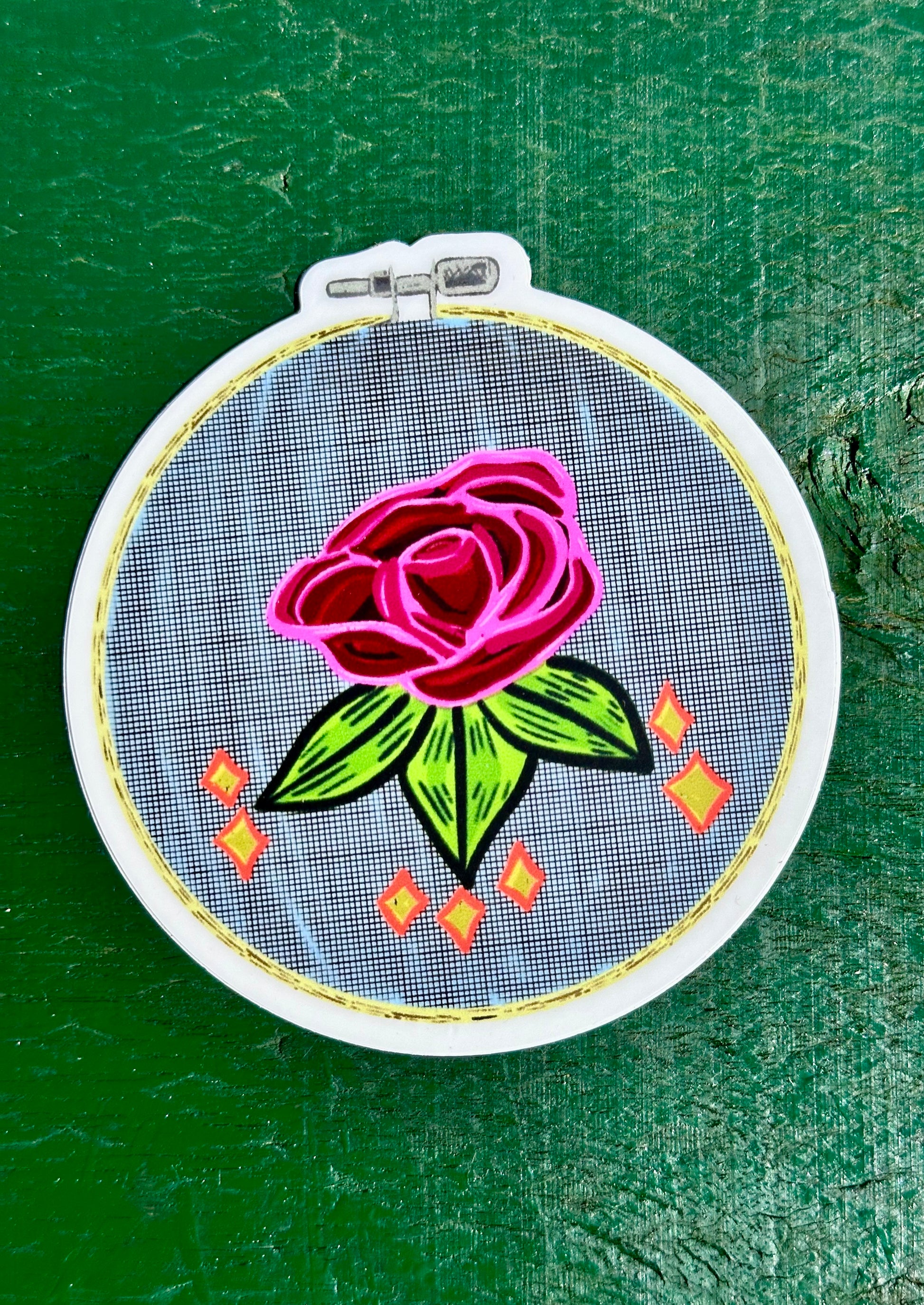 Inspired by a hand-made embroidered frame piece that hangs up as a wall decor; the Rose Sticker is a shared moment of what true love can spark for anyone. Originally made for a beloved human who lived in a spirt of kindness, beauty & grace.
