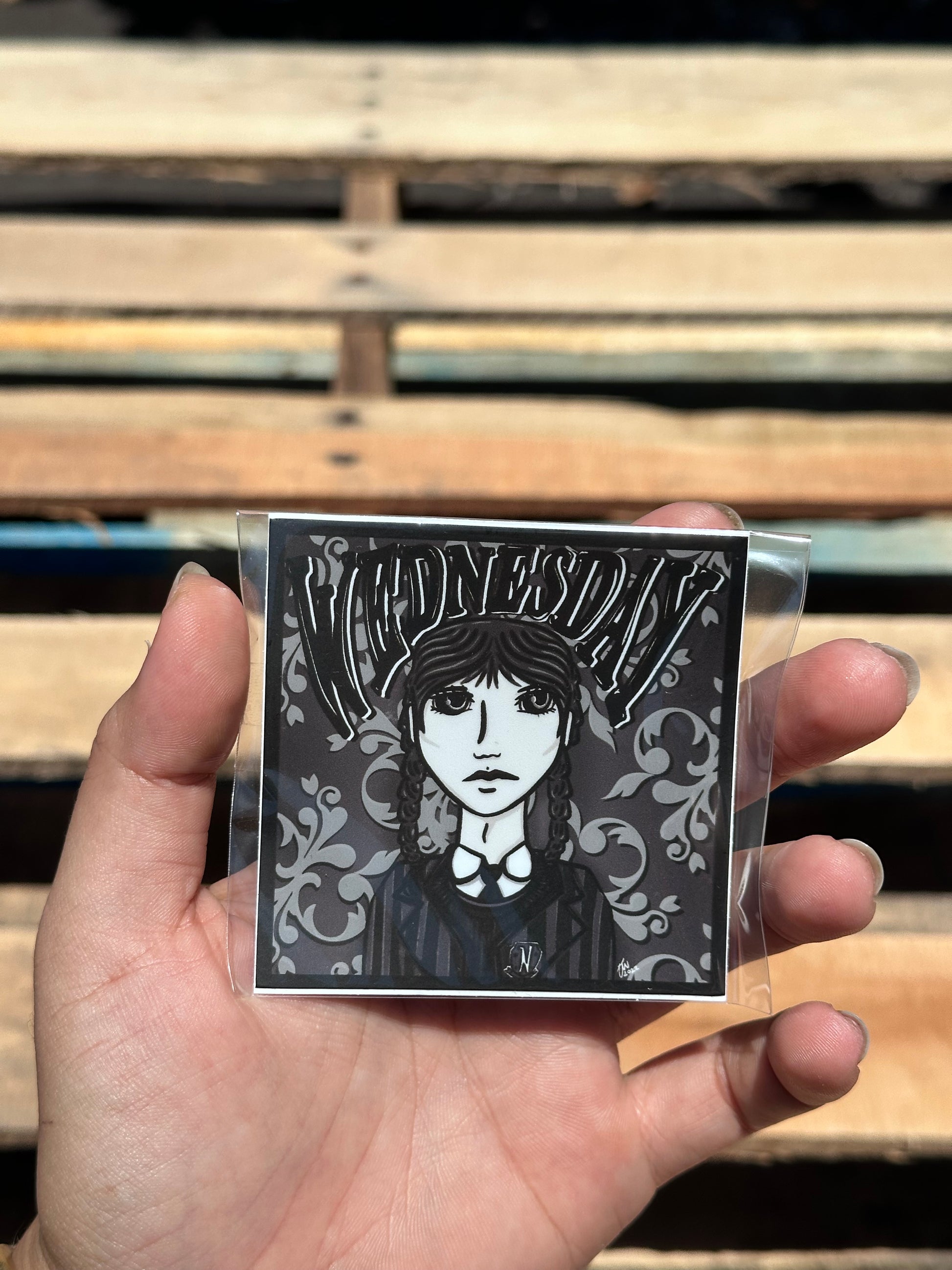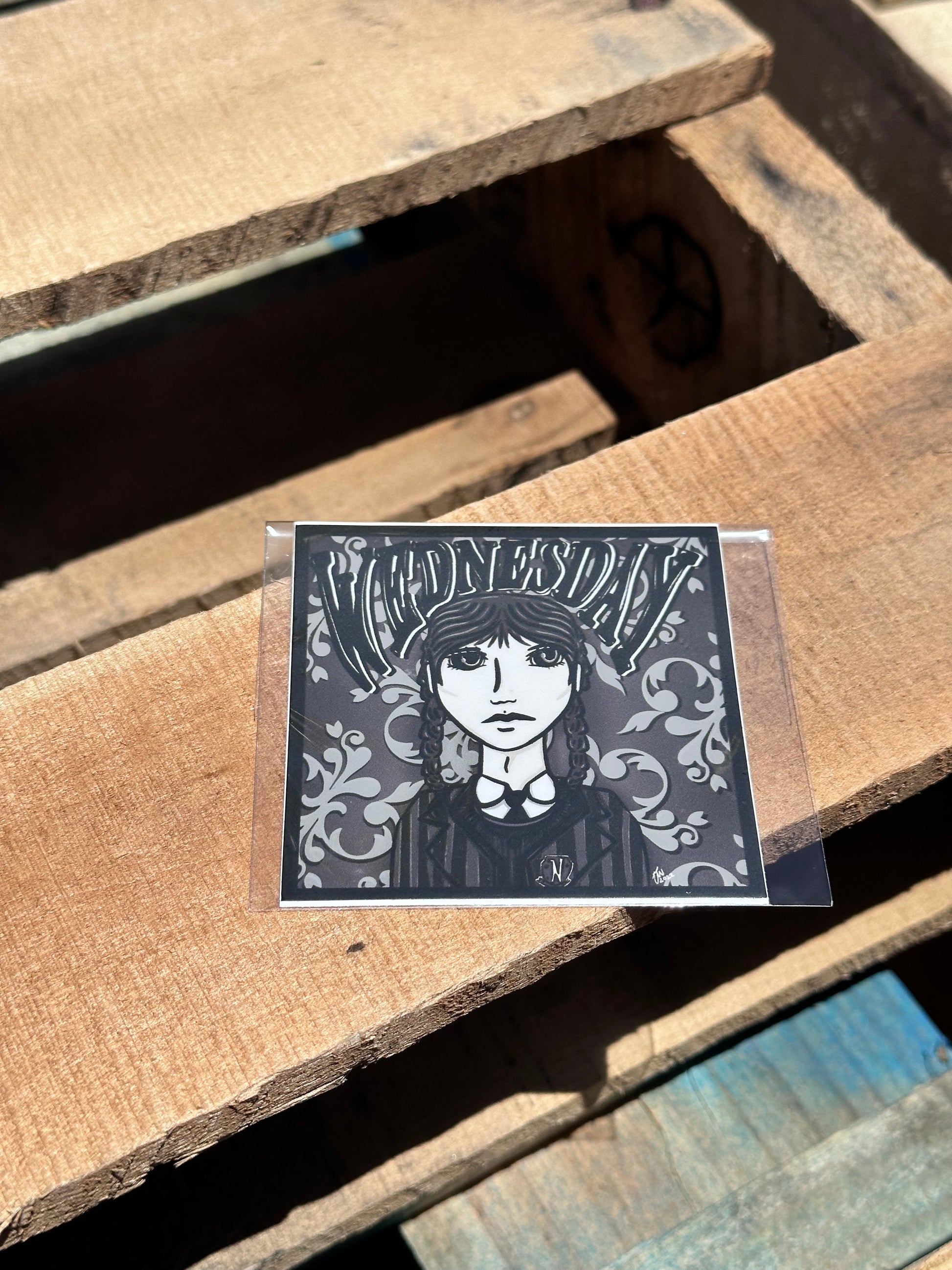 Art Sketch of the Wednesday Addams icon in a gothic uniform attire with a Victorian background.