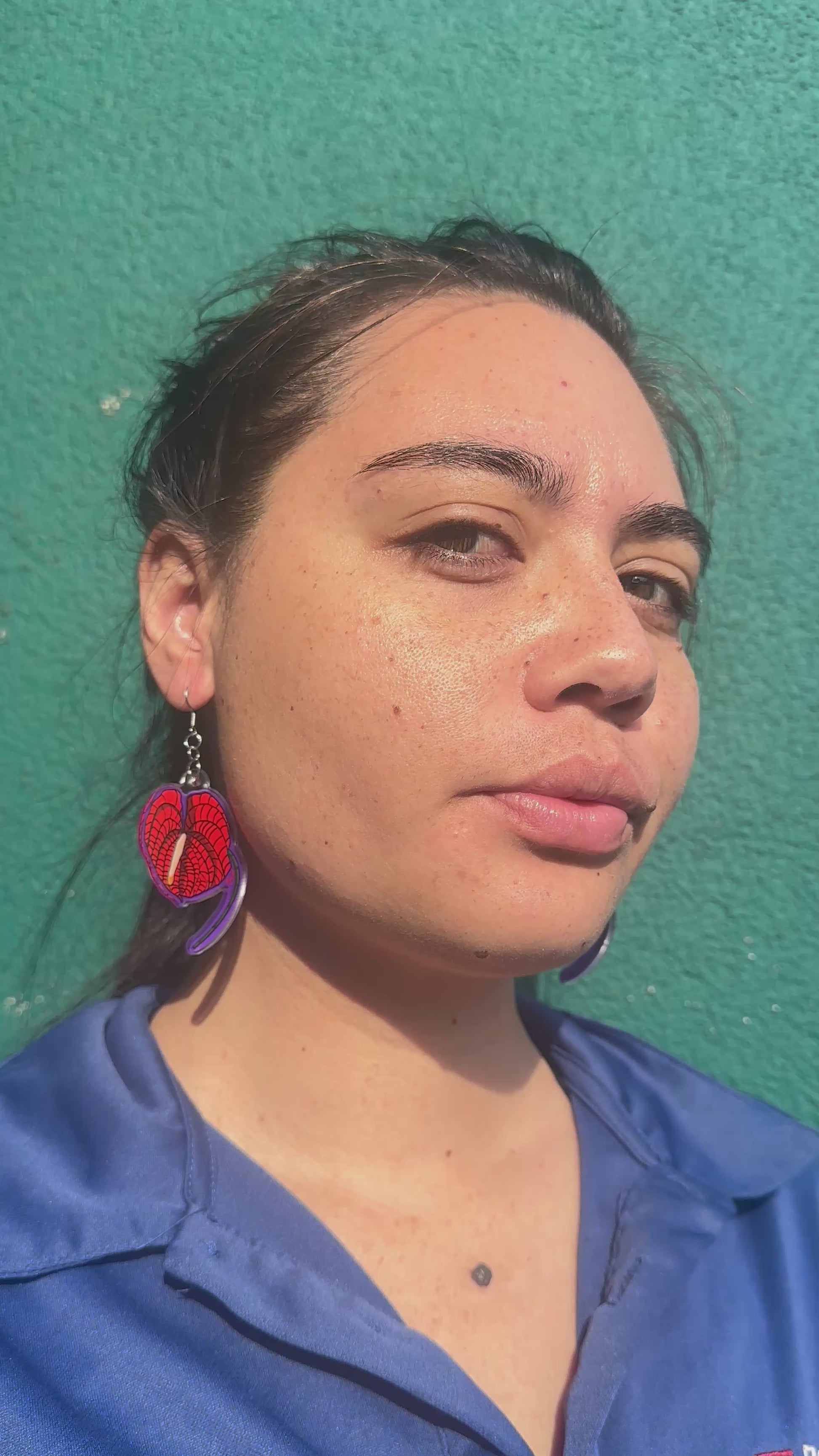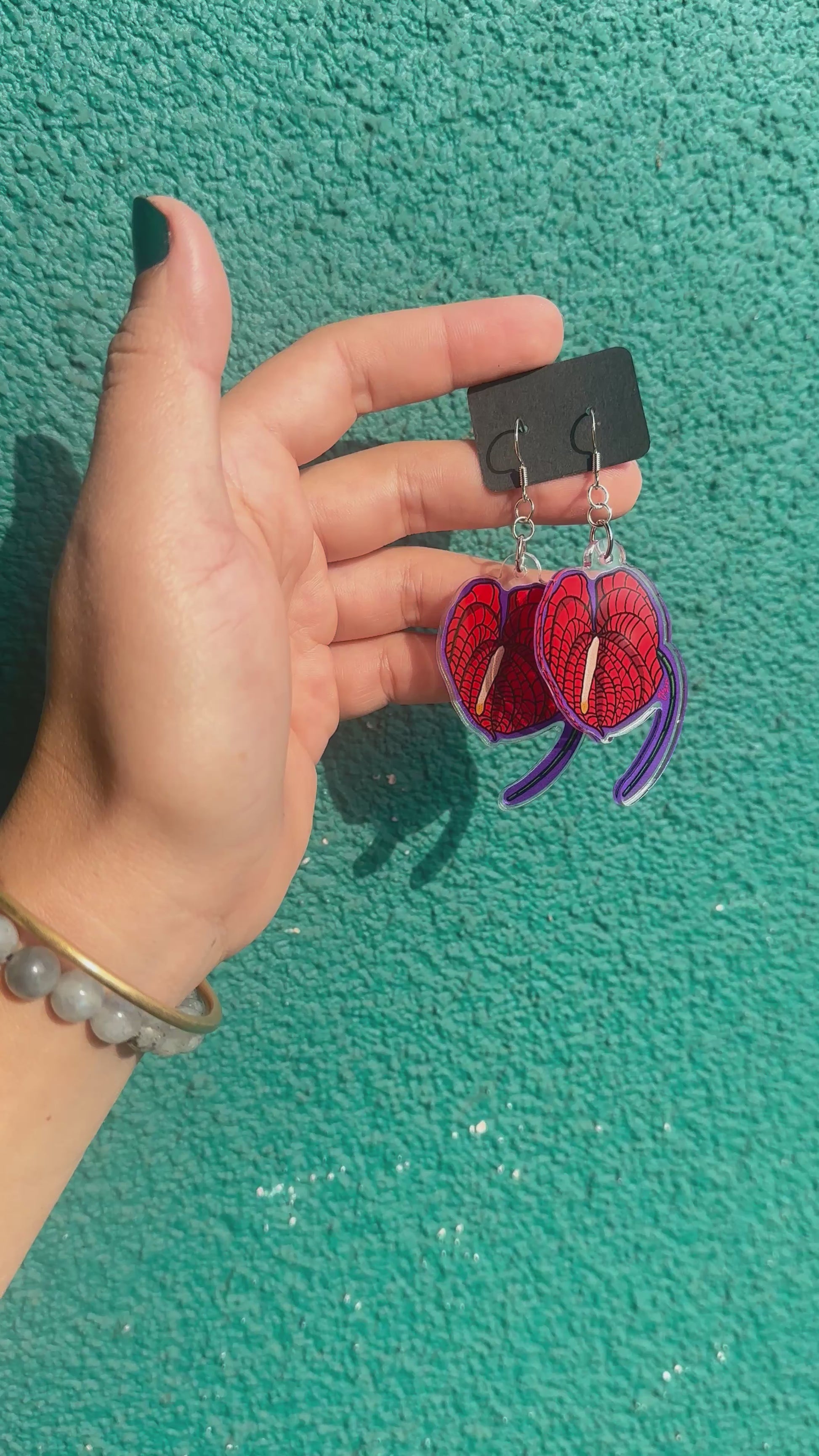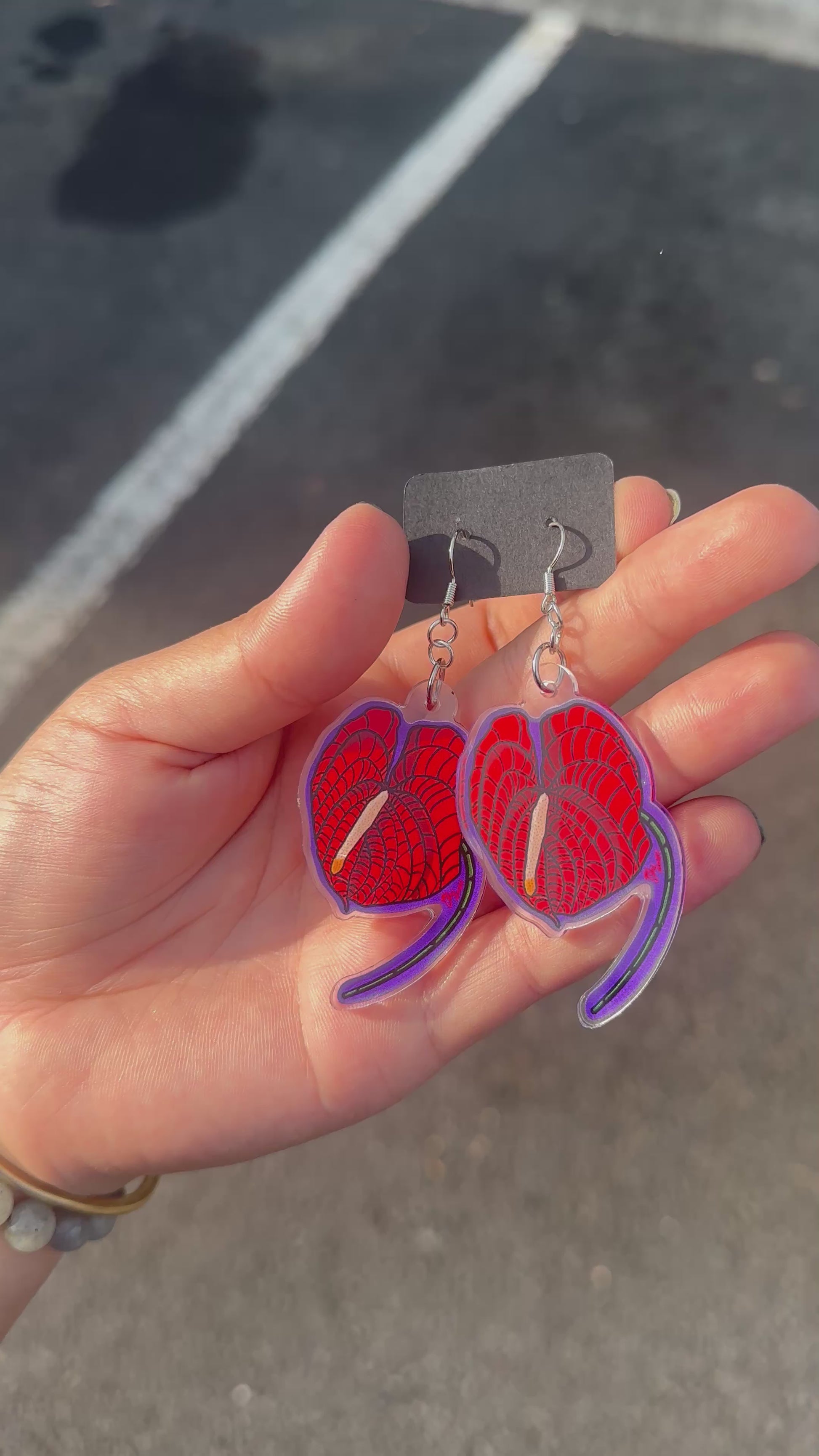 Anthurium Flower Earrings is a durable acrylic single print design. With a purple boarder framing the flower.