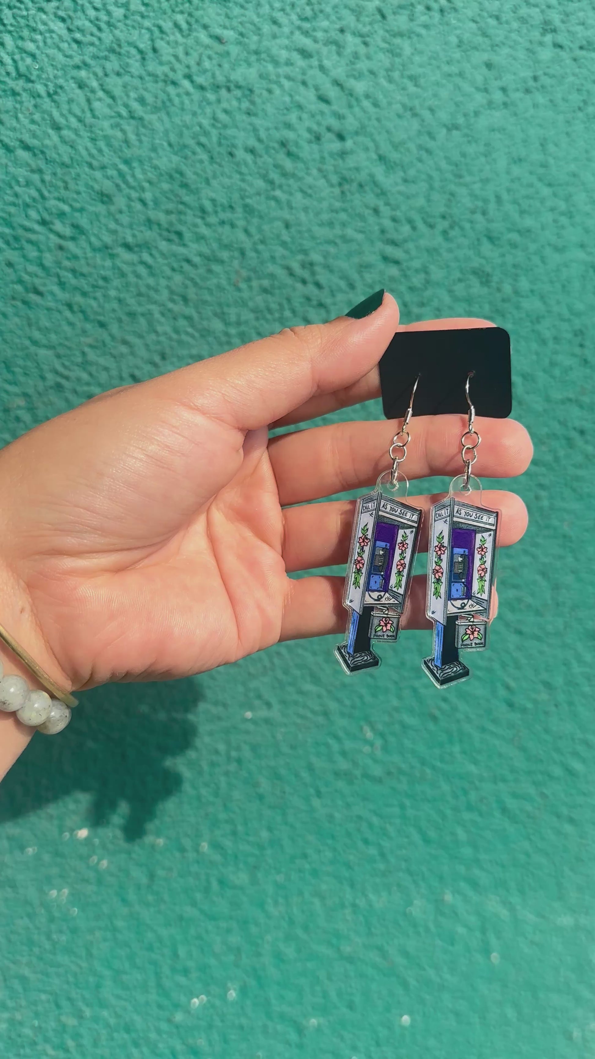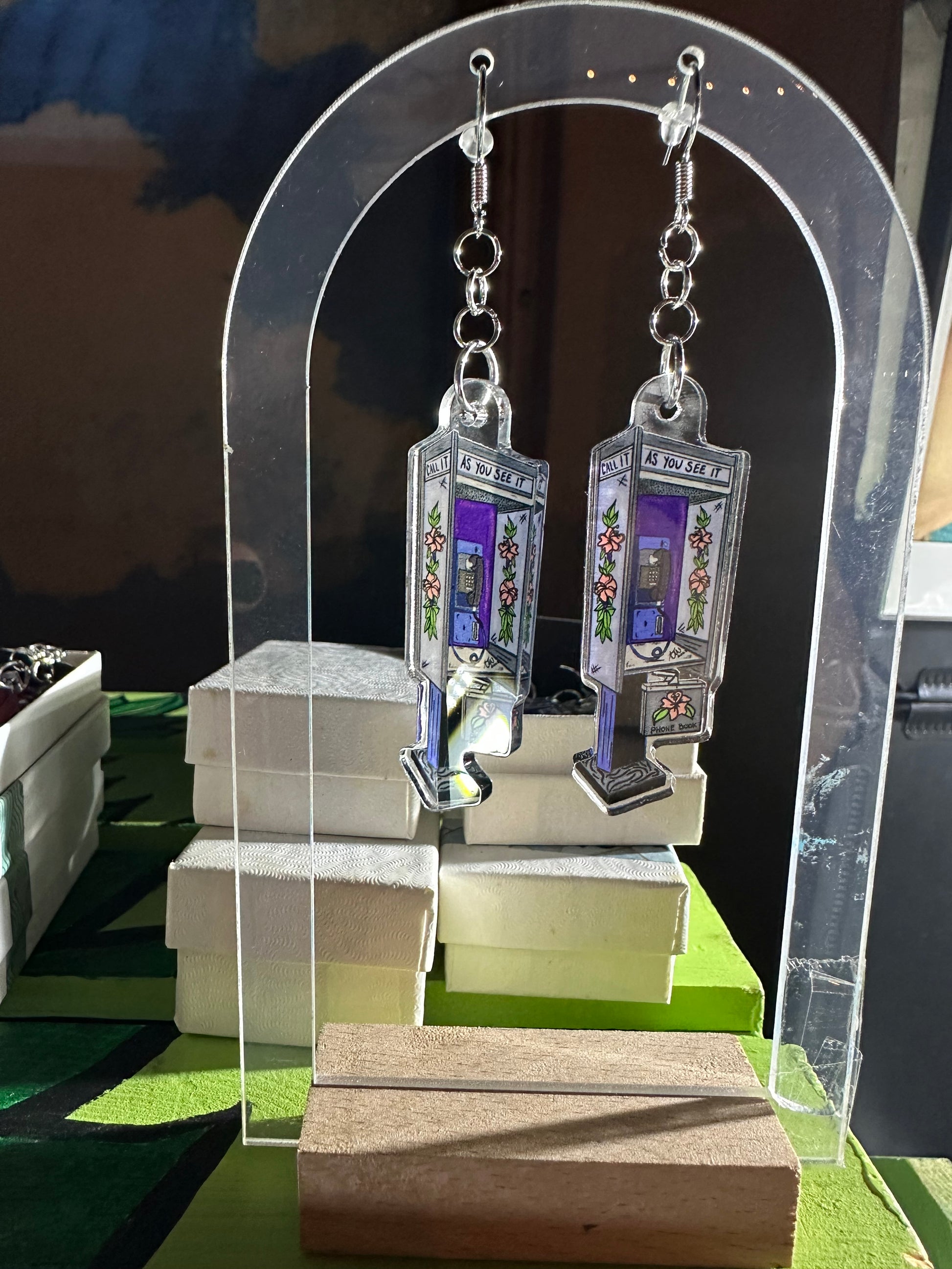 “Call it as you see it” Retro Phone Booth Earrings is a durable acrylic single print design.