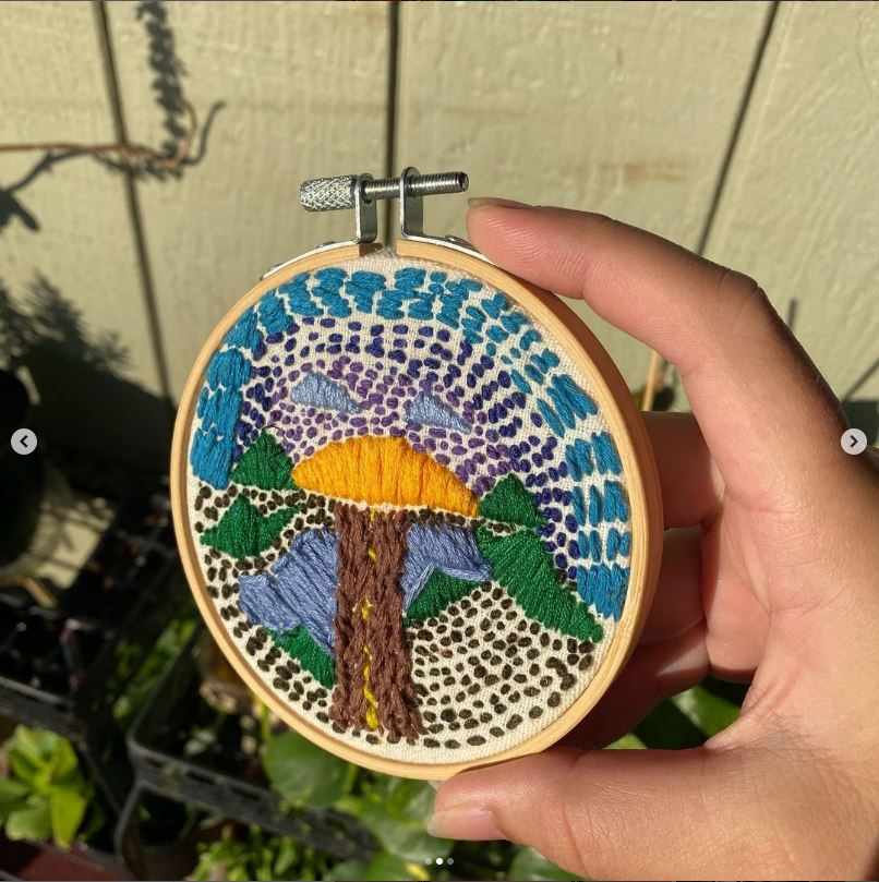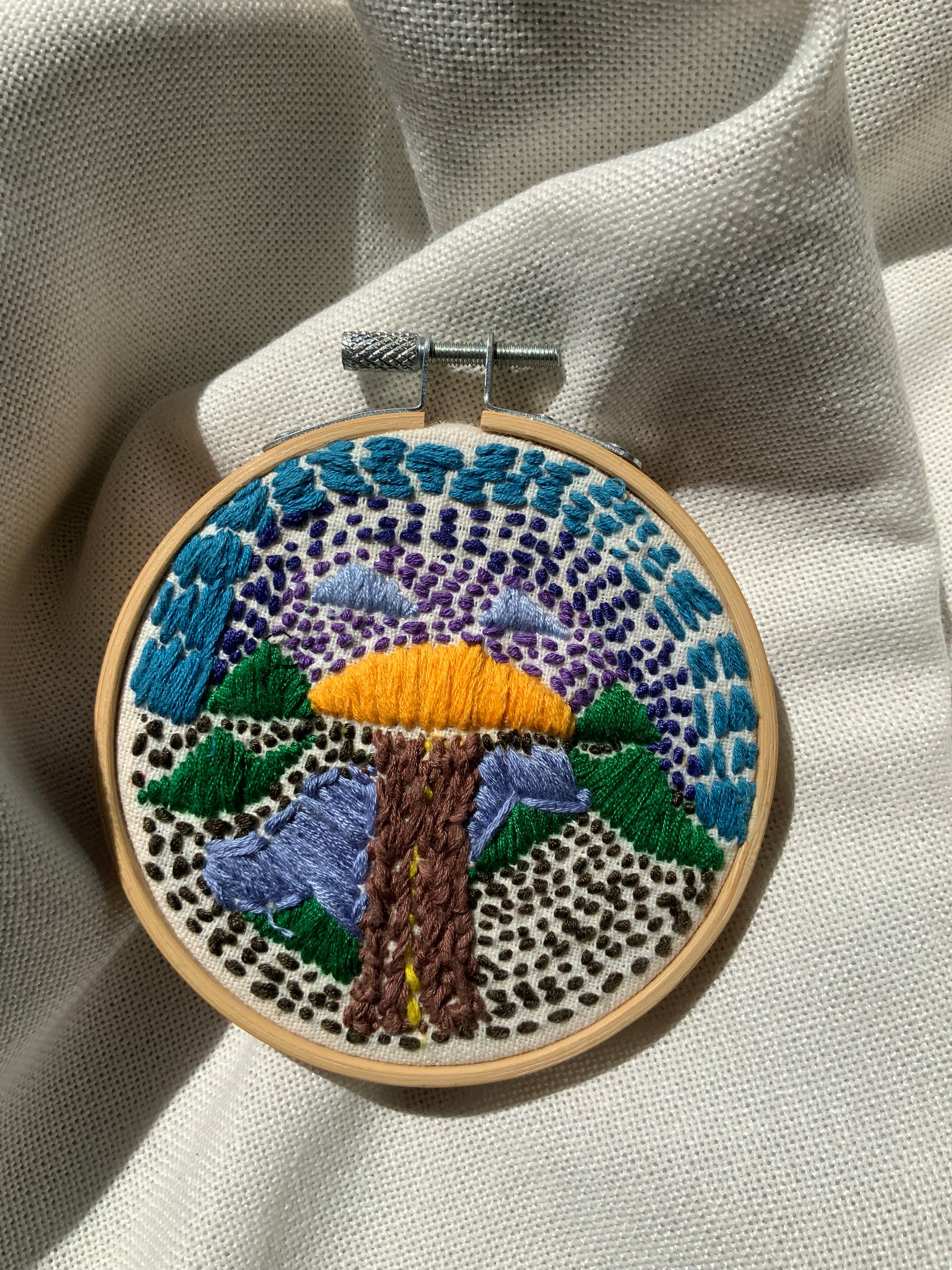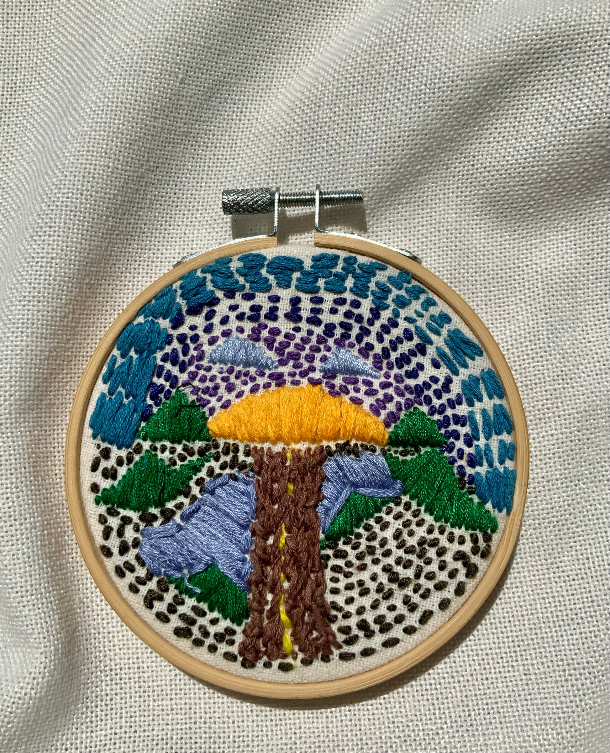 Escape into the Sunset ⛅️⛰️Featuring an embroidered road into the sunset with a river in the valley. Used a Dot-Dash Sew Technique on a mini cross-stitch frame. #embroidery #stitch #flower #frame #sewing #handmade #supportsmallbusiness