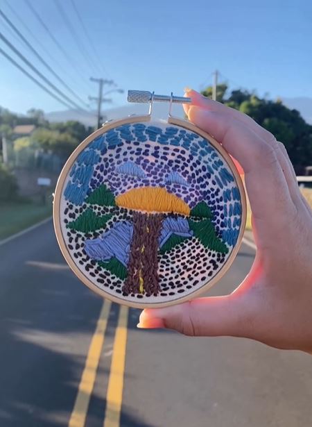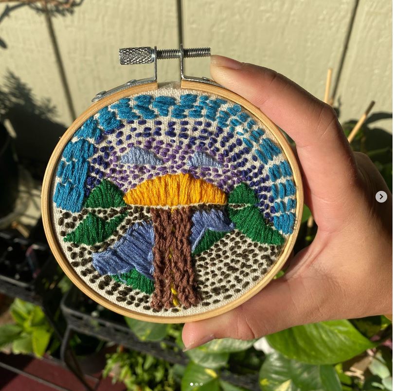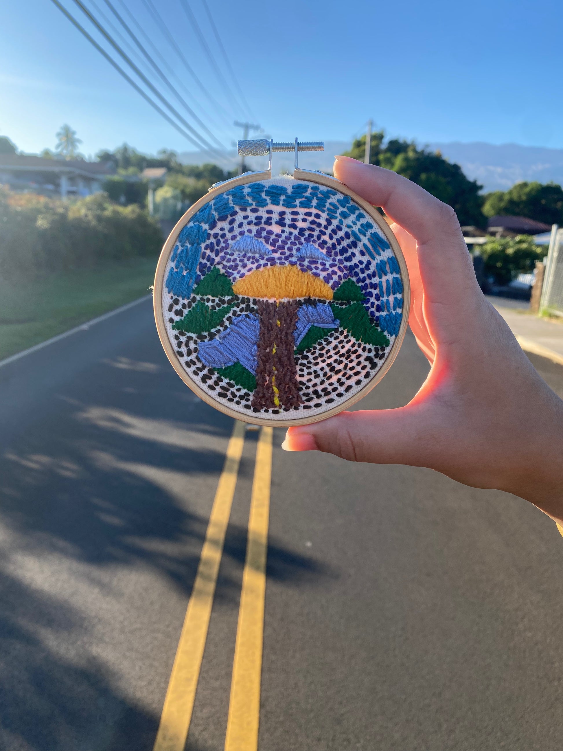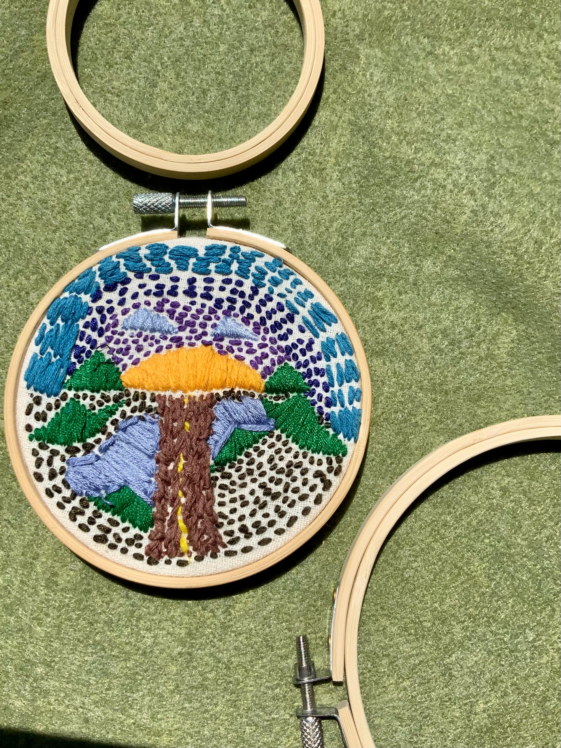 Escape into the Sunset ⛅️⛰️Featuring an embroidered road into the sunset with a river in the valley. Used a Dot-Dash Sew Technique on a mini cross-stitch frame. #embroidery #stitch #flower #frame #sewing #handmade #supportsmallbusiness