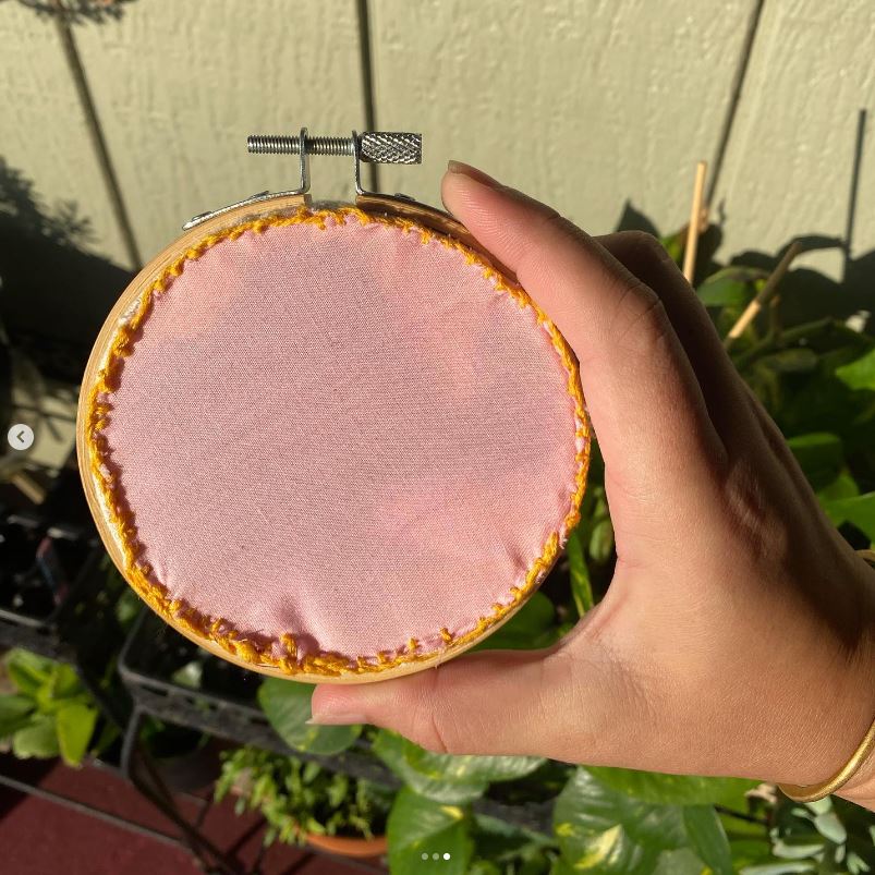 Escape into the Sunset Abstract Hand Embroidery Hoop Art is 6x6" with handing string.