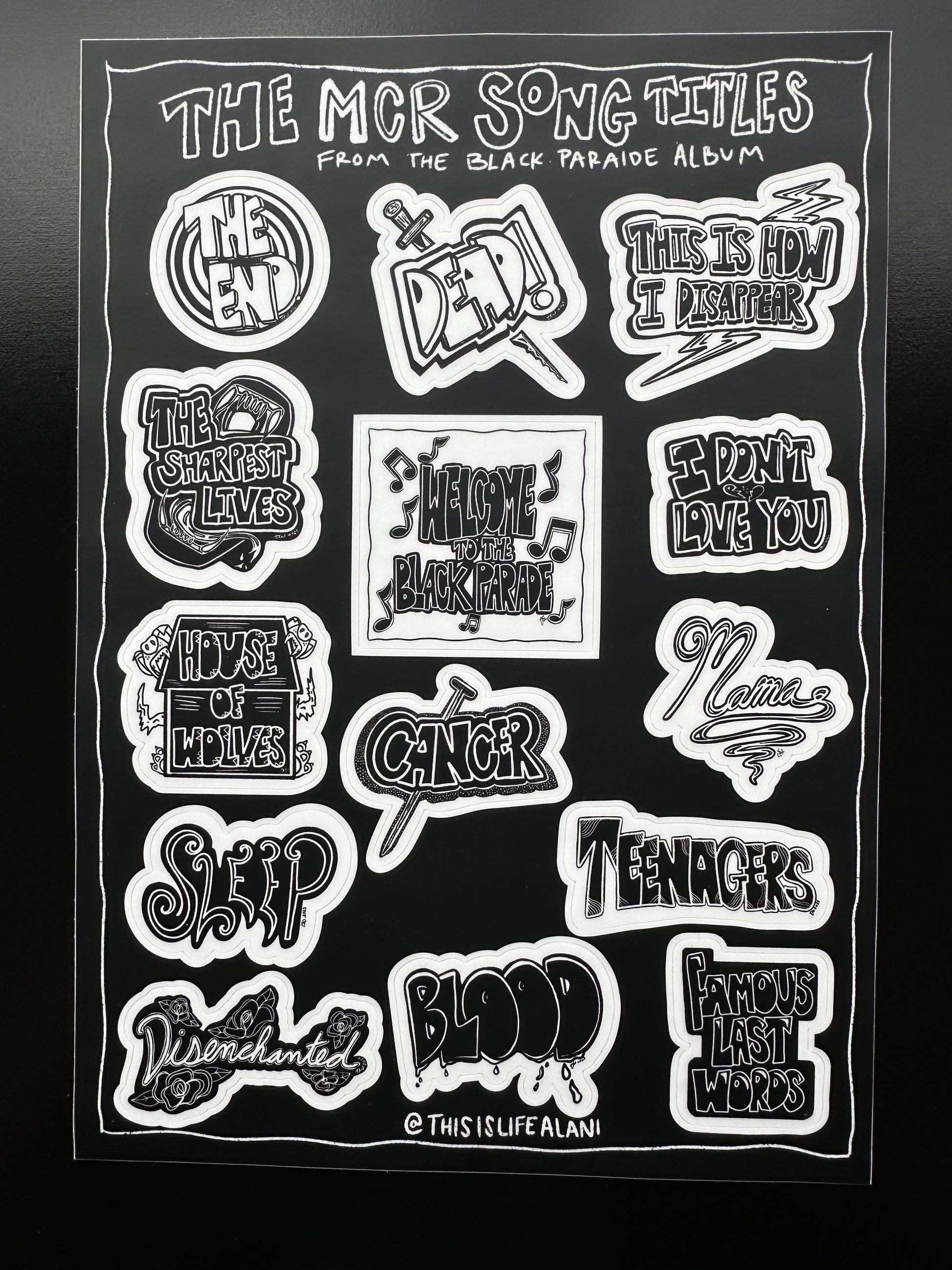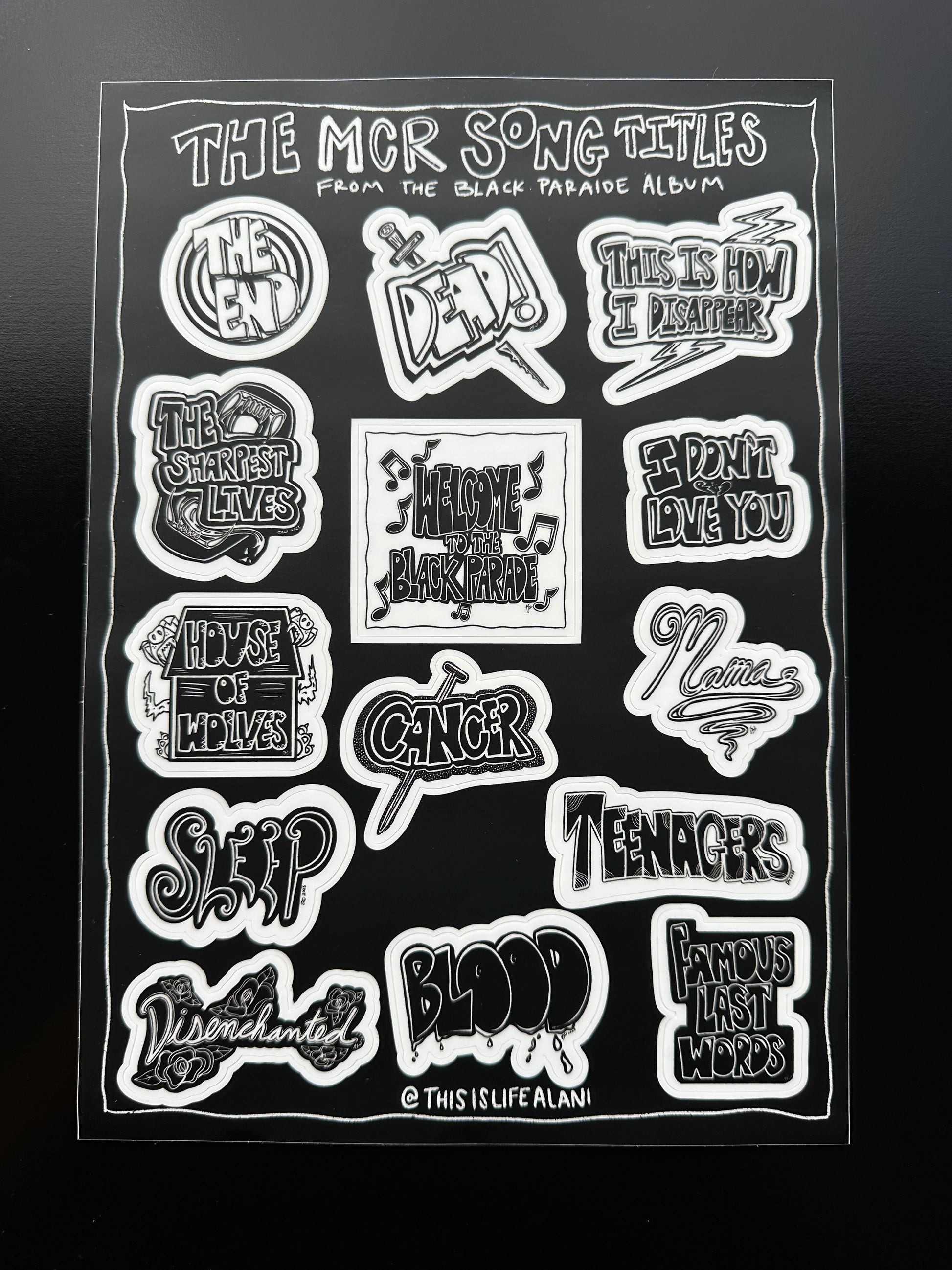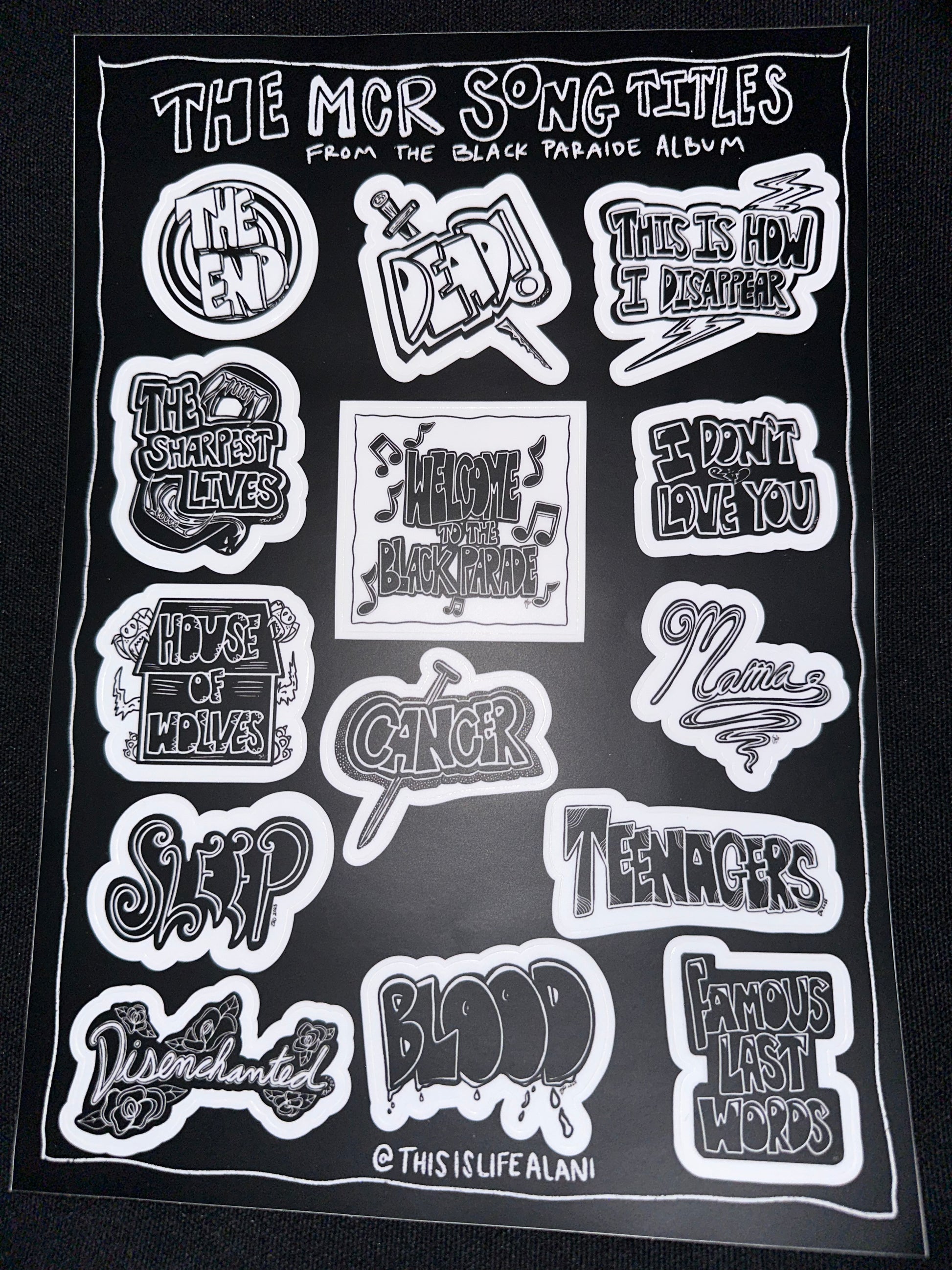 Large Sticker sheet with 14 individual 2.5x2.5”vinyl stickers in black & white designs inspired by the the iconic Album by MyChem