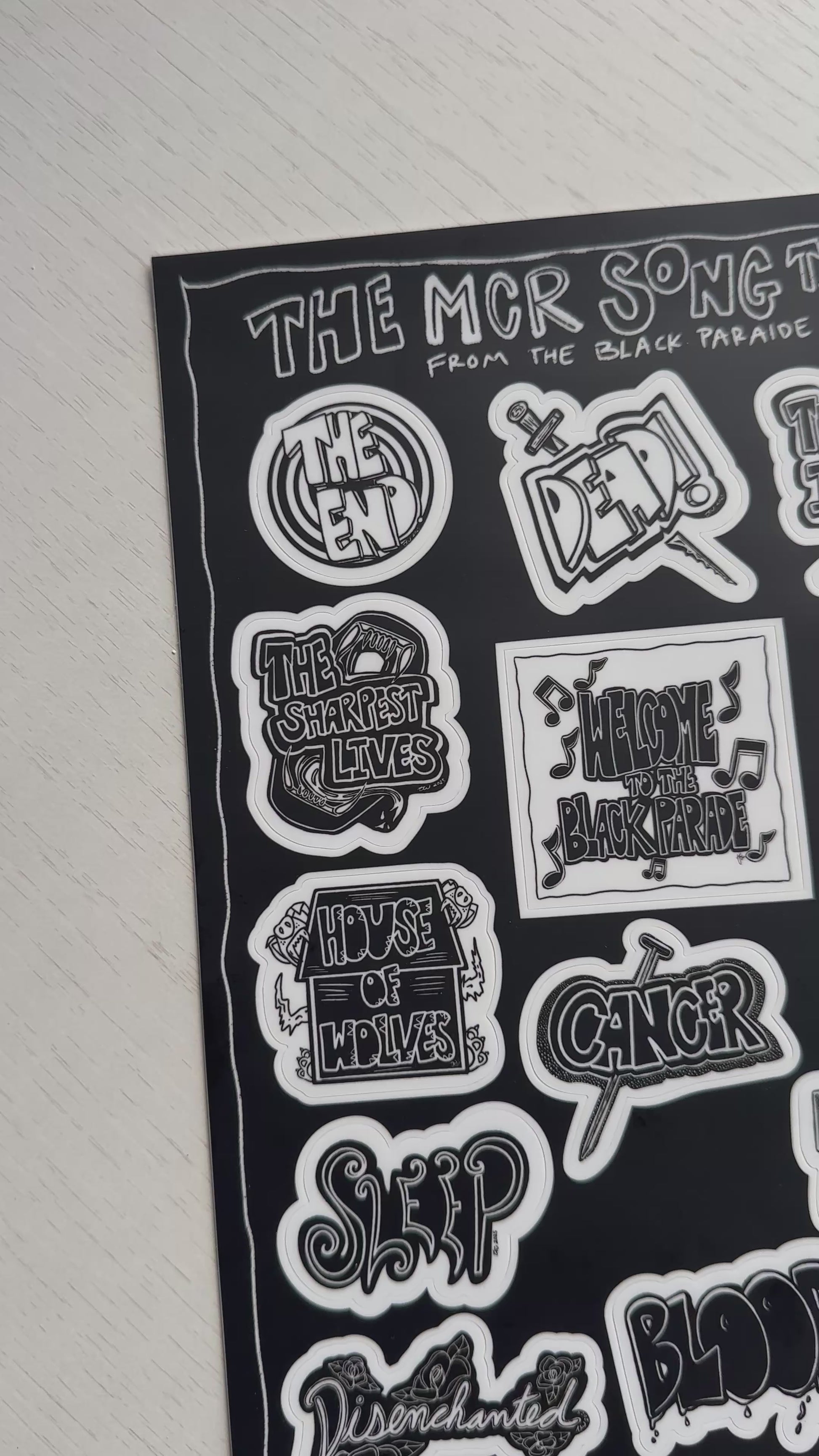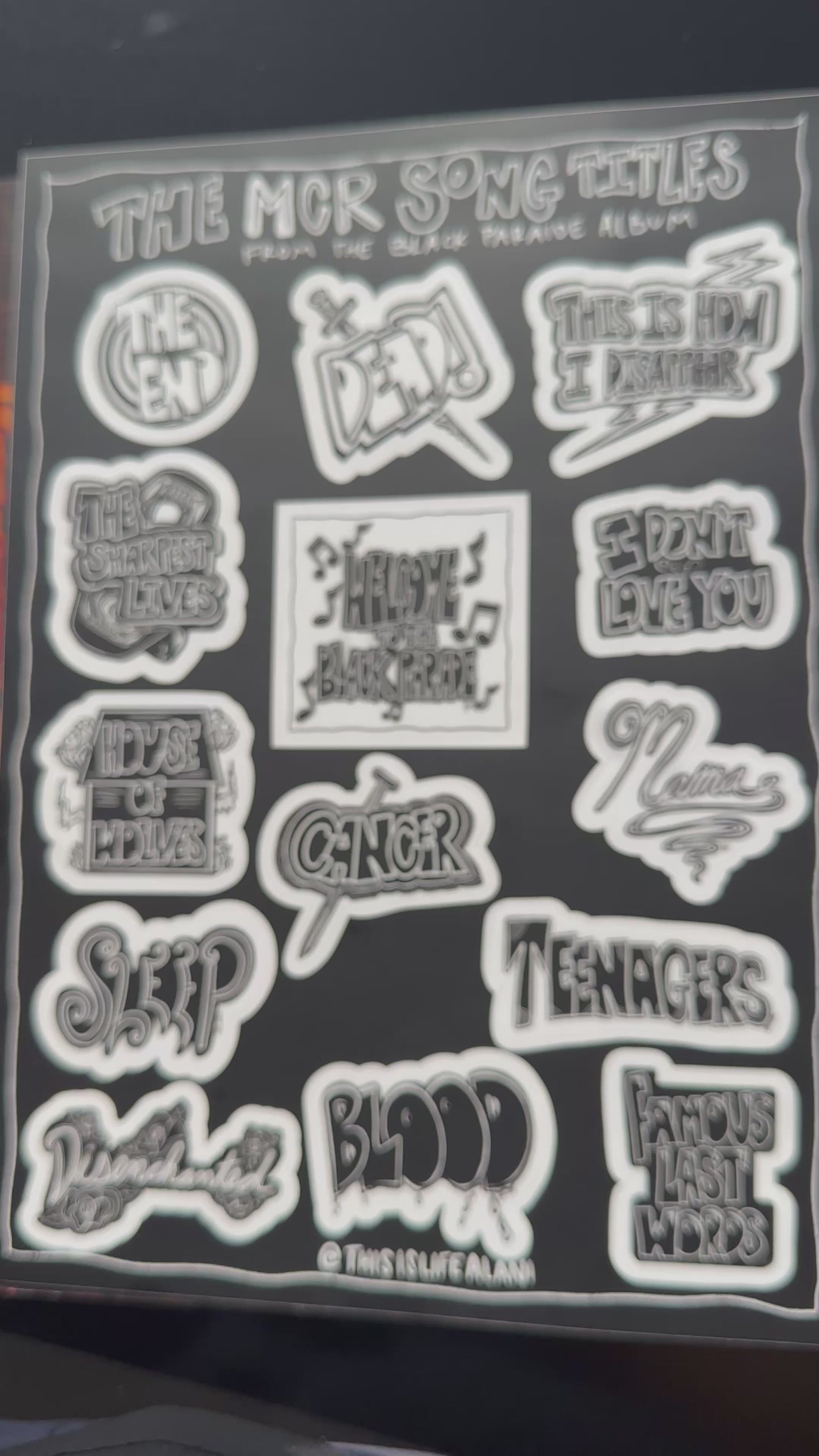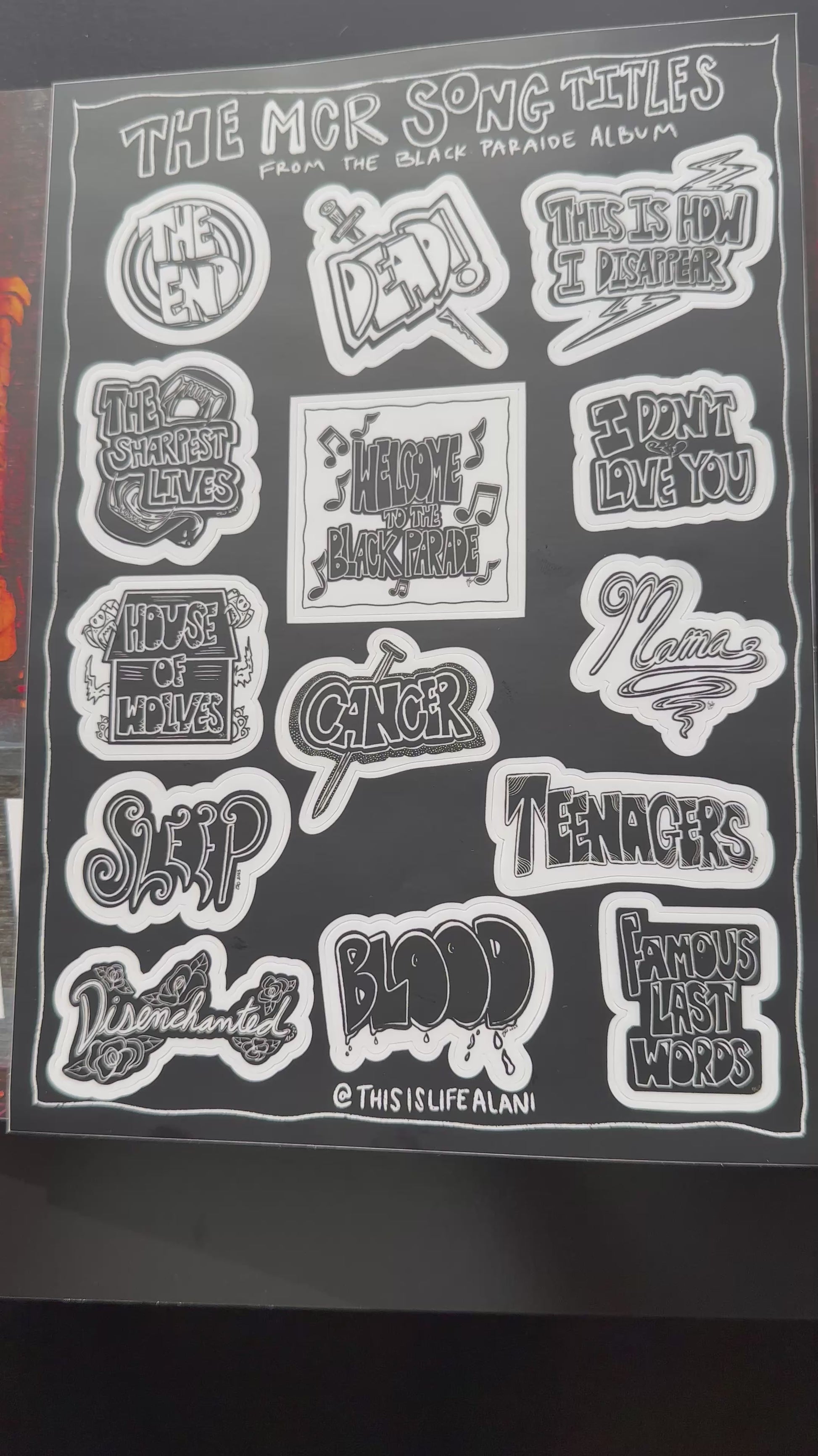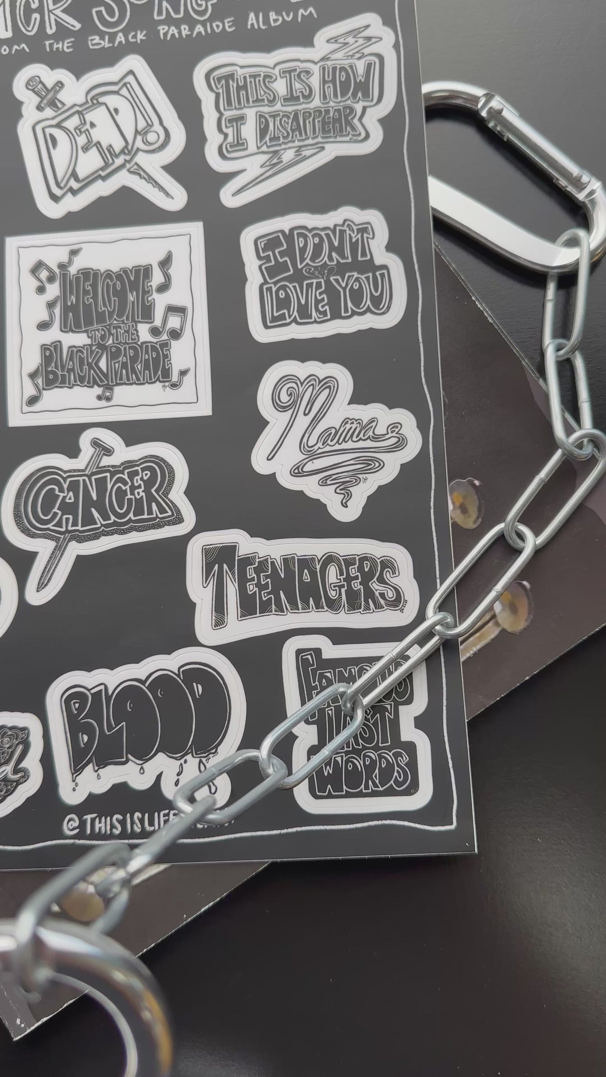 Large Sticker sheet with 14 individual 2.5x2.5”vinyl stickers in black & white designs inspired by the the iconic Album by MyChem